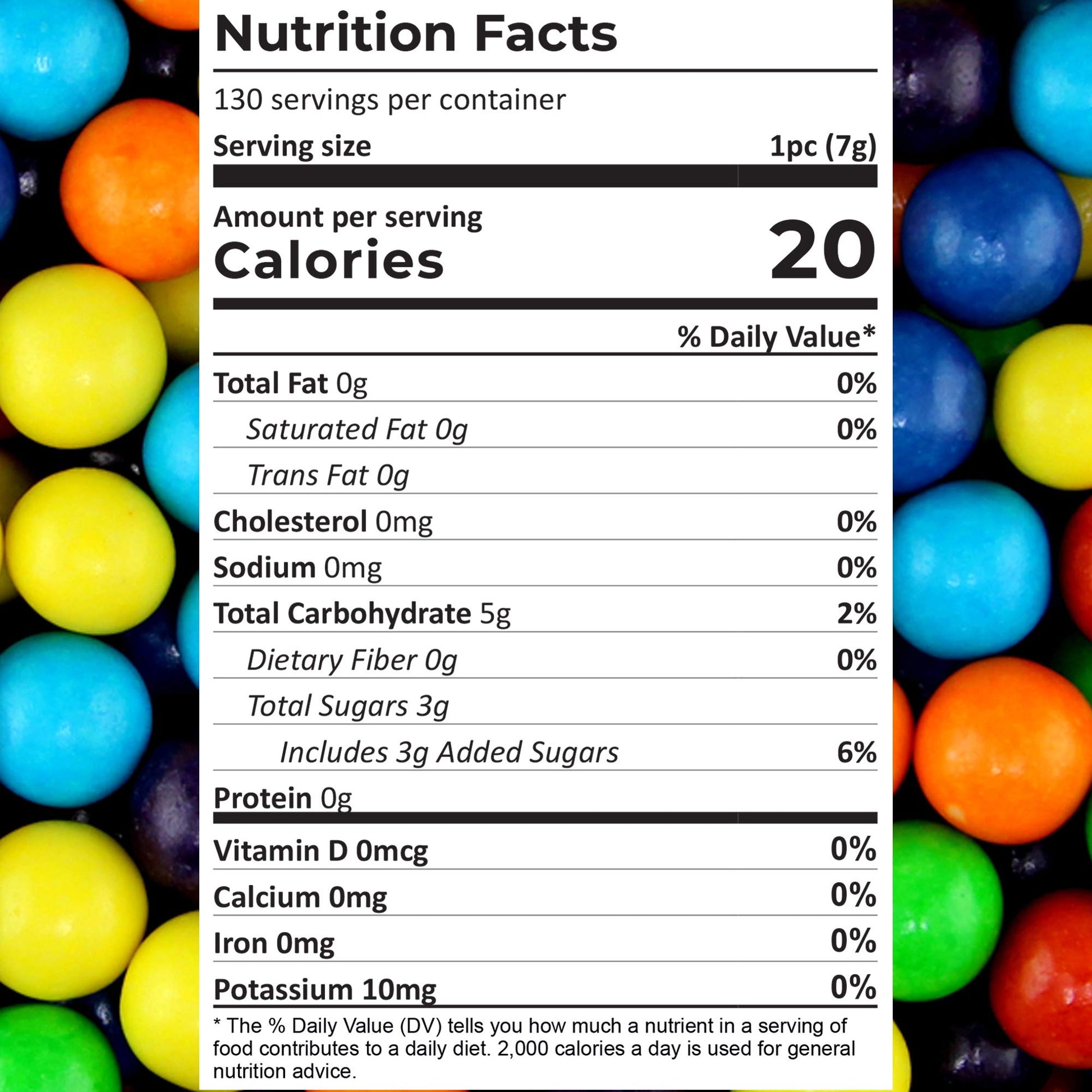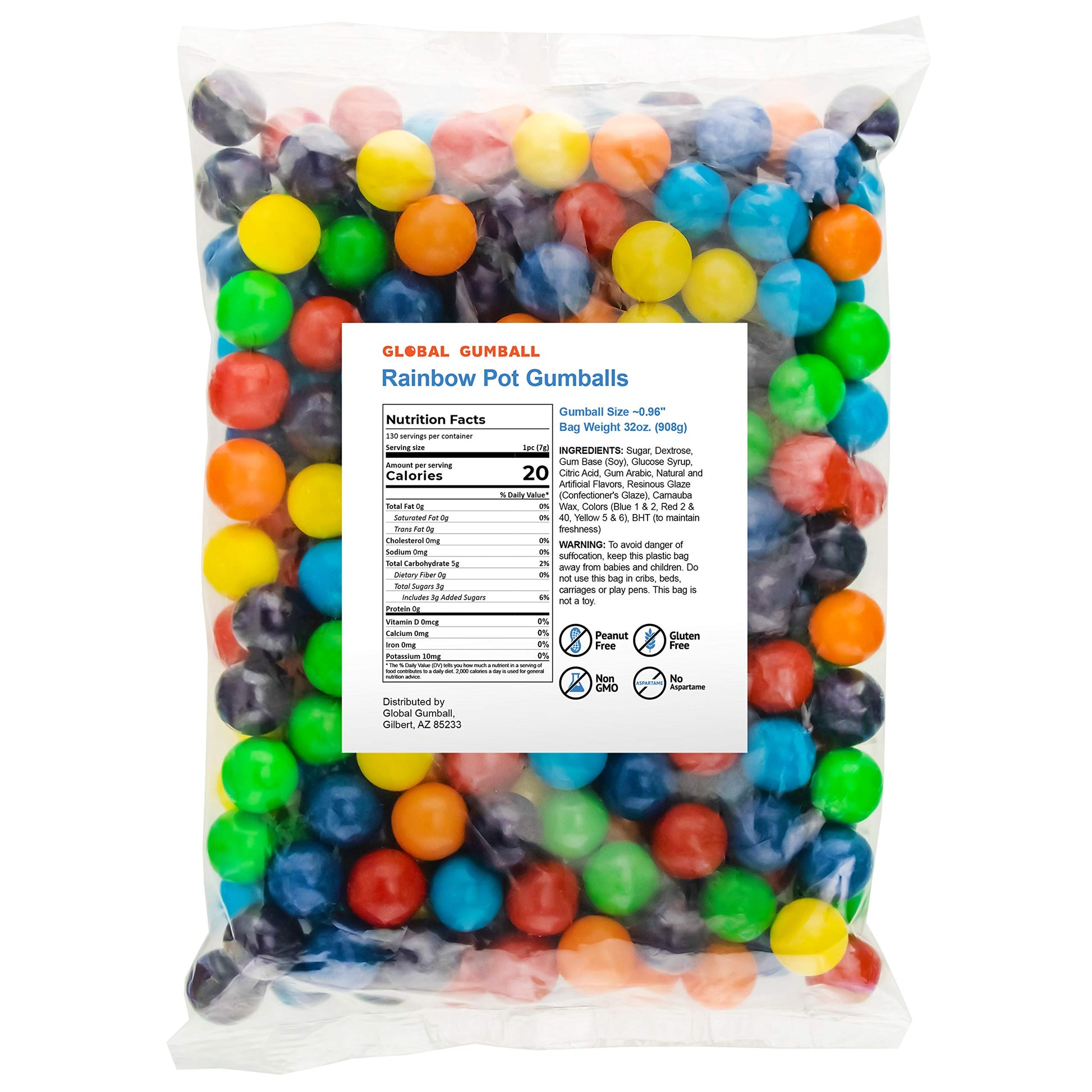 Gumballs bulk package weight: 2 lbBubble gum balls size: approximately 0.9 inches or 23 mmQuantity: approximately 135 gumballs for gumball machineBulk gum colors: Red, Orange, Yellow, Green, Light blue, Blue and PurpleBubble gum flavoring: Cherry, Orange, Banana, Apple, Mint, Tutti-Frutti and BerriesTrying to find a bubble gumball refill? With these tasty assorted bubble gum balls in bulk you have found it!These round bubble gumballs will conquer with their vast variety. Gumballs 1 inch bulk package includes 7 eye-catching colors - red, orange, yellow, green, light blue, blue and purple. Color gumballs are exciting for children - they love tasting them all and choosing their favorite bubblegum gum ball.Deliciously flavored bulk gumball taste will pleasantly suprise you. For these 1 inch gumballs they are cherry, orange, banana, apple, mint, tutti-frutti and berries.Gumball bubble gum size is approximately 0.9 inches or 23 mm. These big gumballs are the perfect fit for a home vending machine or a small gumball machine with 1 inch dispensing wheel. Colorful gumballs bring children a lot of fun and excitement while they are trying to get that bubble yum gumball gum quicker.Bubble gum for kids comes in a convenient package of 2 pounds. You may refill gumballs in your gum machine just once so that bubble gum machine gumballs stay fresh. Also, gum for bubble gum machine in a small package is easy to store, rathar than finding a place for that massive package of other colored gum balls.If you think that gumballs for gumball machines 1 inch in diameter are only good as gumball refills for machine, we have news for you. These gum balls for kids are tremendous as an edible decoration for cakes and cupcakes. Moreover, gumballs for gumball machines are a great birthday and party favors giveaway. This bubble gum bulk package will be a life-savior for a candy buffet too.